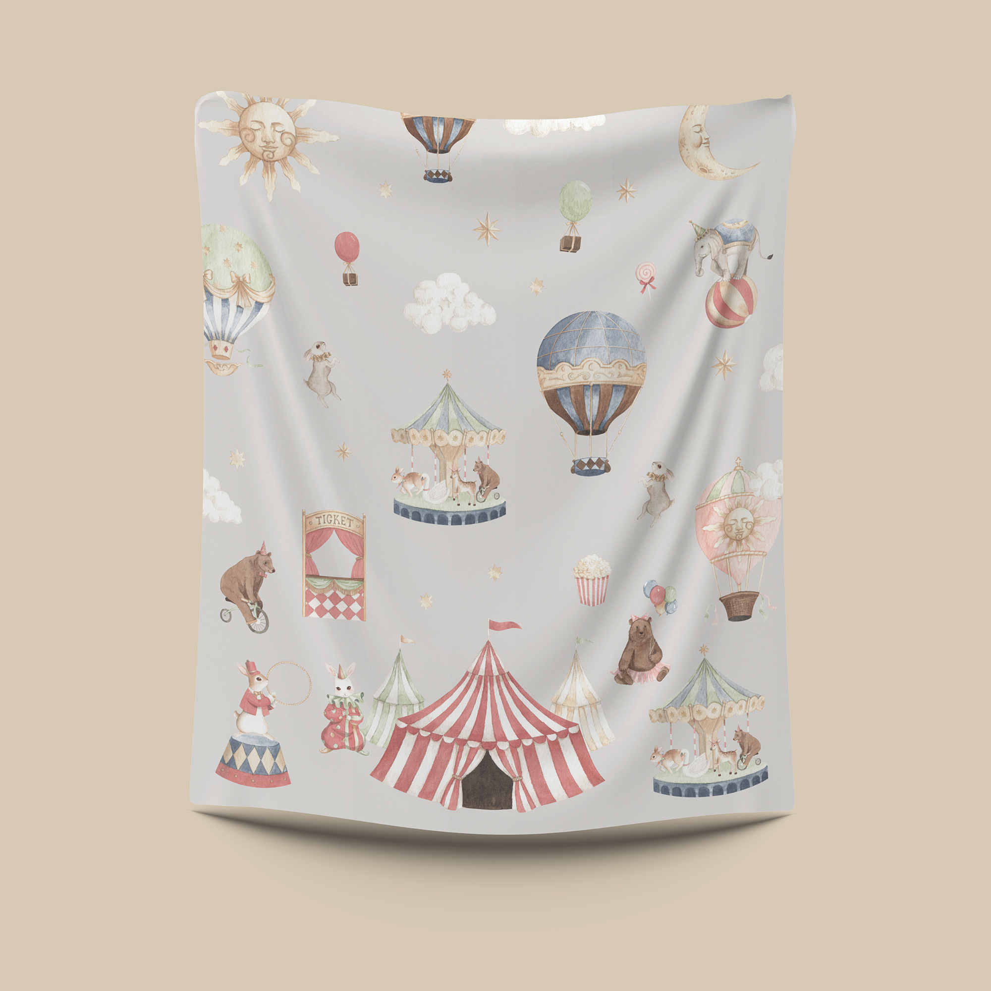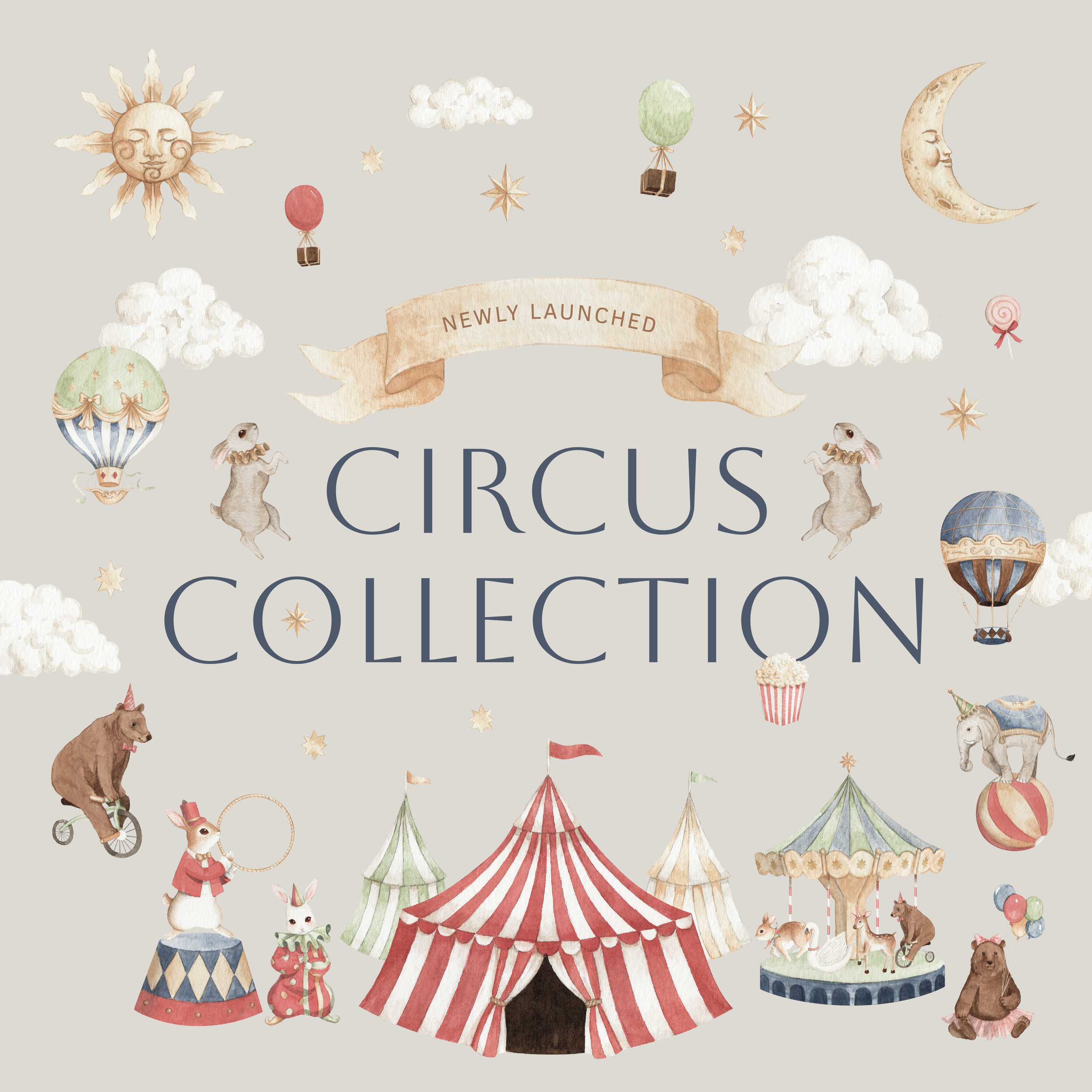 Circus Collection is a set of visual assets commissioned by Twinkewish, a hampers brand specializing in customizable blankets. The main theme was about circus animals with a color scheme that is suitable for any gender. The illustrations were created with watercolor first and then composed digitally.