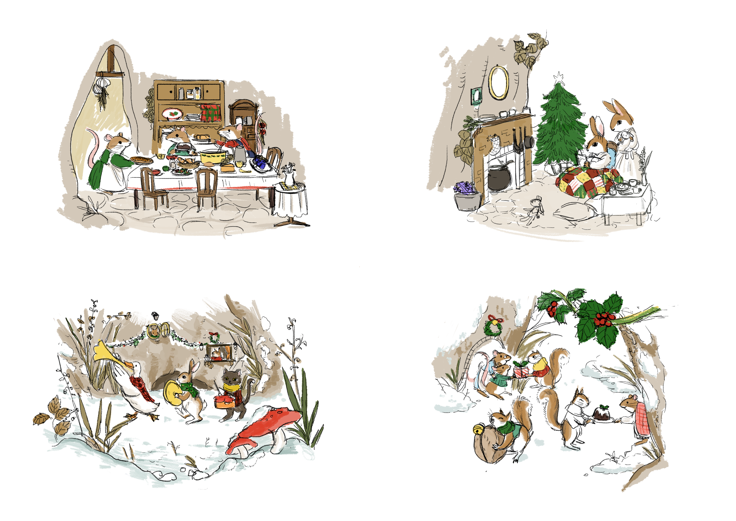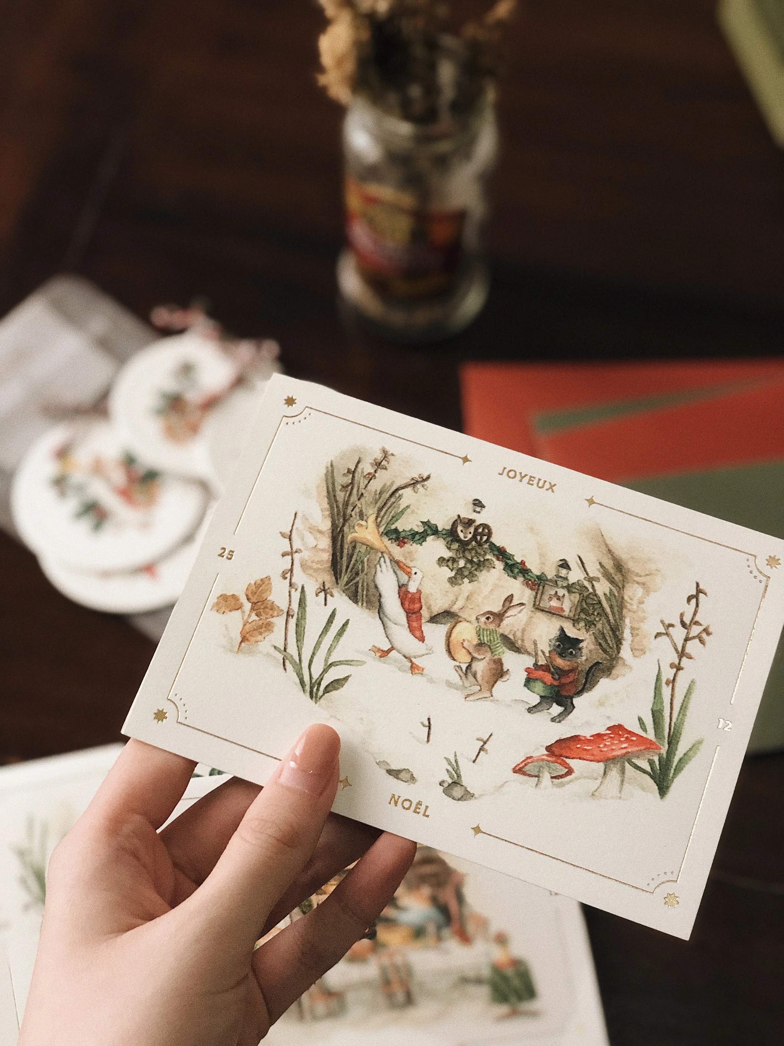 A Woodland Christmas is a series of limited edition greeting cards and Christmas tree paper ornaments. Ever since I was young, I have always loved looking at greeting cards, especially during Christmas. Nowadays, people don't use greeting cards anymore, and I feel the magic of Christmas is fading as we get older. To evoke those magical moments, I tried to create these greeting cards as close to how I remembered the classic greeting cards: using watercolor illustrations, decorated with gold foil, and complimented with classic red and green envelopes.
